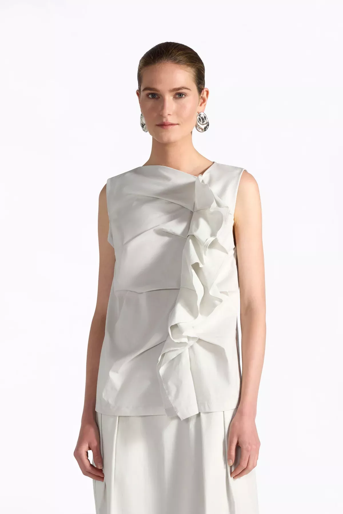 Camisa de popelina sin mangas con fruncidos y costuas en la parte delantera que crean un drapeado. Escote ligeramente asimétrico.