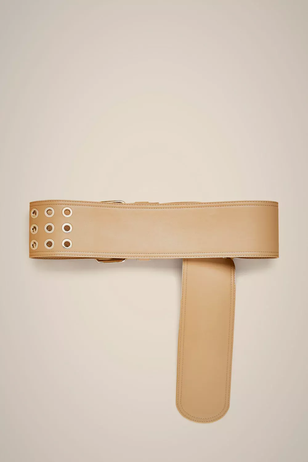 Cinturón alto de piel vegana con ojales y hebilla de metal plateado. Ancho de 8cm.