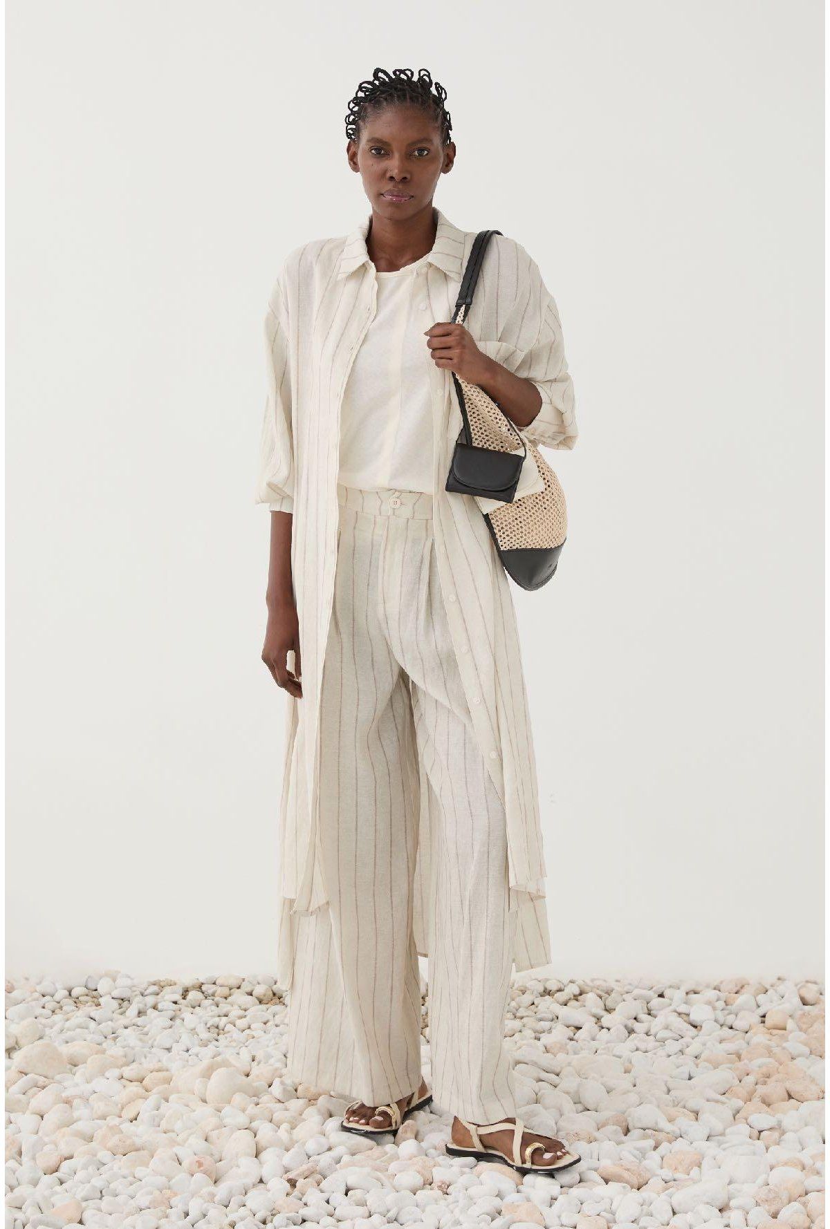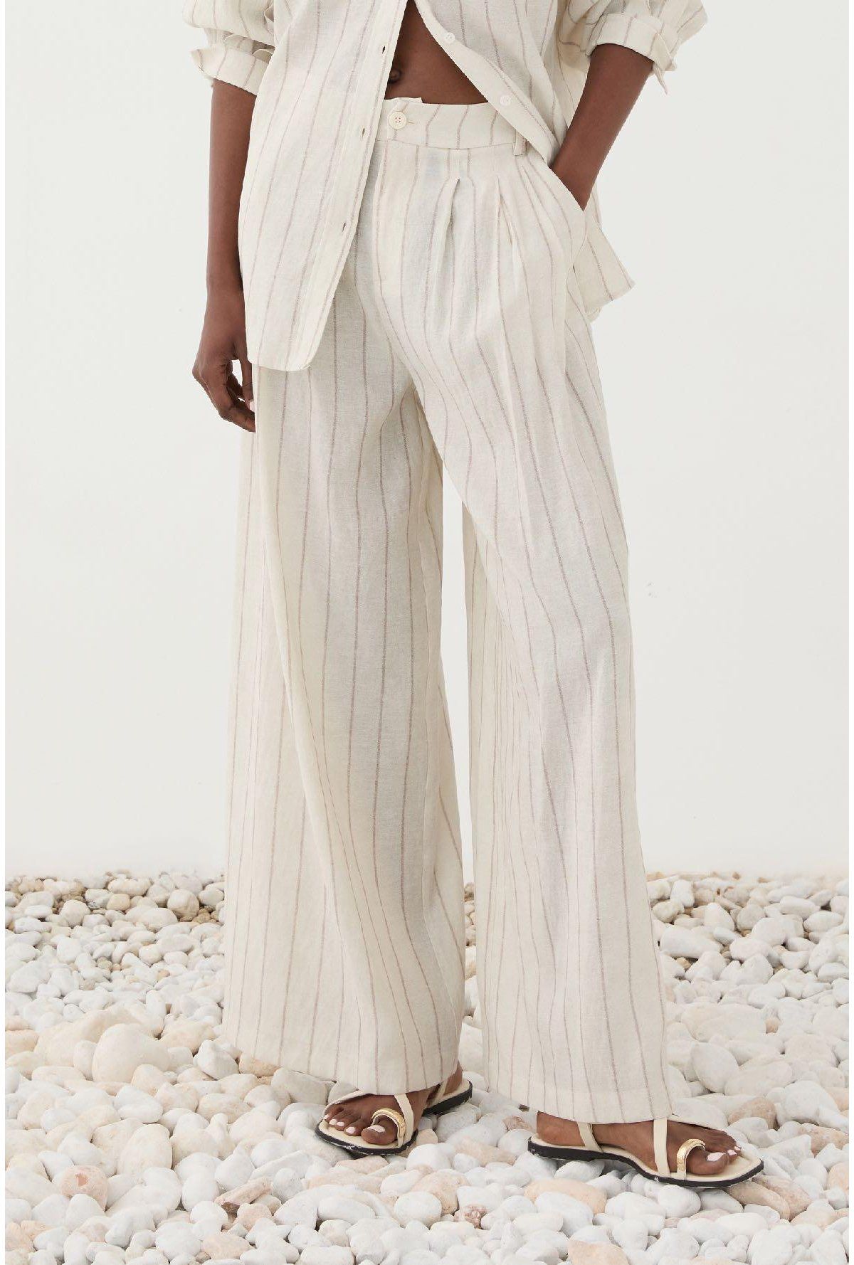 Podrás lucir maravillosa esta temporada, con nuestros pantalones de efecto lino y estampado de rayas elegantes. Confeccionados en color crudo, cuentan con cierre de cremallera y botón y cómodos bolsillos. La silueta de pierna ancha contribuye a la sensación relajada pero elegante que estos pantalones transmiten.