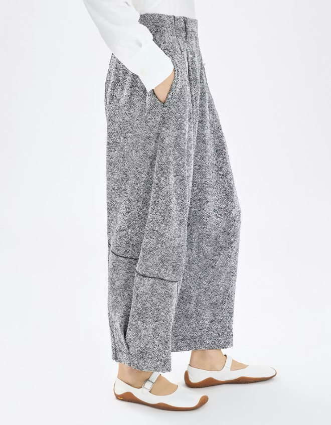Confeccionados en jersey elástico texturizado con efecto tweed, los pantalones Prospero presentan un estilo relajado, definido por su pernera ancha, tiro muy bajo y largo hasta el tobillo. Las costuras negras en contraste realzan su estética. Cinturilla con trabillas. Cierre frontal con bragueta y cremallera metálica. Pliegues delanteros. Bolsillos laterales inclinados. Costuras en contraste. • Jersey elástico texturizado, de grosor medio y tacto suave.