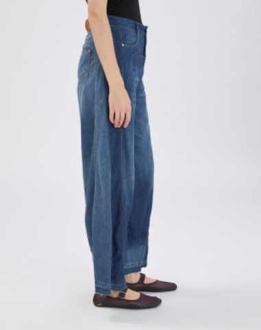Nuevo corte y detalles con una interpretación de trampantojo en denim ligero teñido en prenda. Corte holgado, perneras anchas en el bajo y cintura regular. Tonos y variaciones de color diseñados intencionalmente para realzar el look reconstruido.