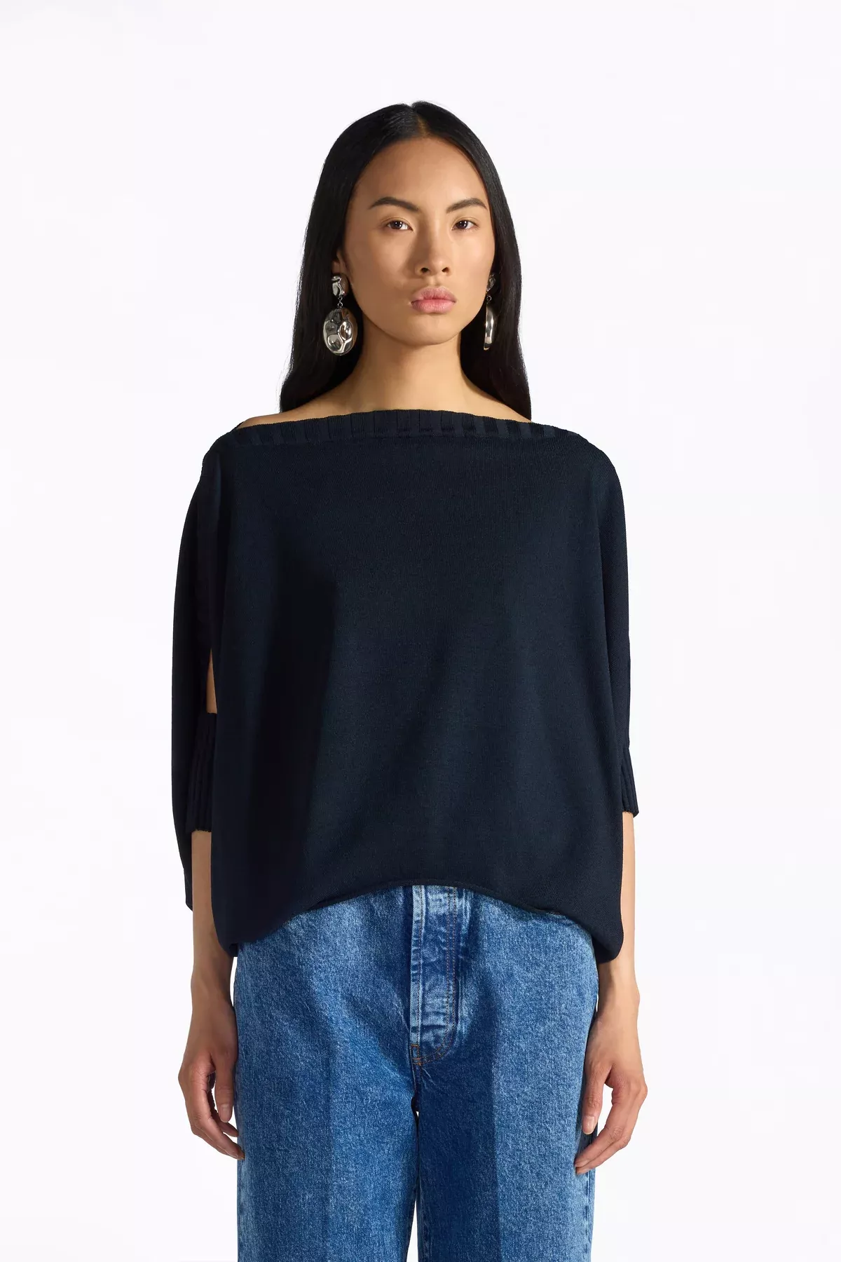 Jersey con mangas hasta el codo en viscosa elástica, escote ancho con borde de canalé, aberturas en los laterales.