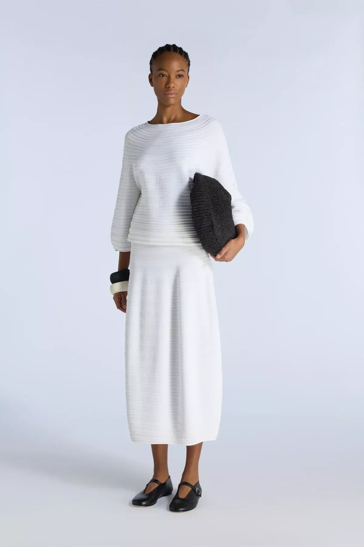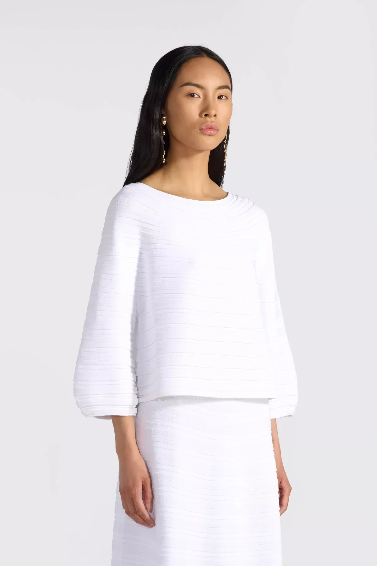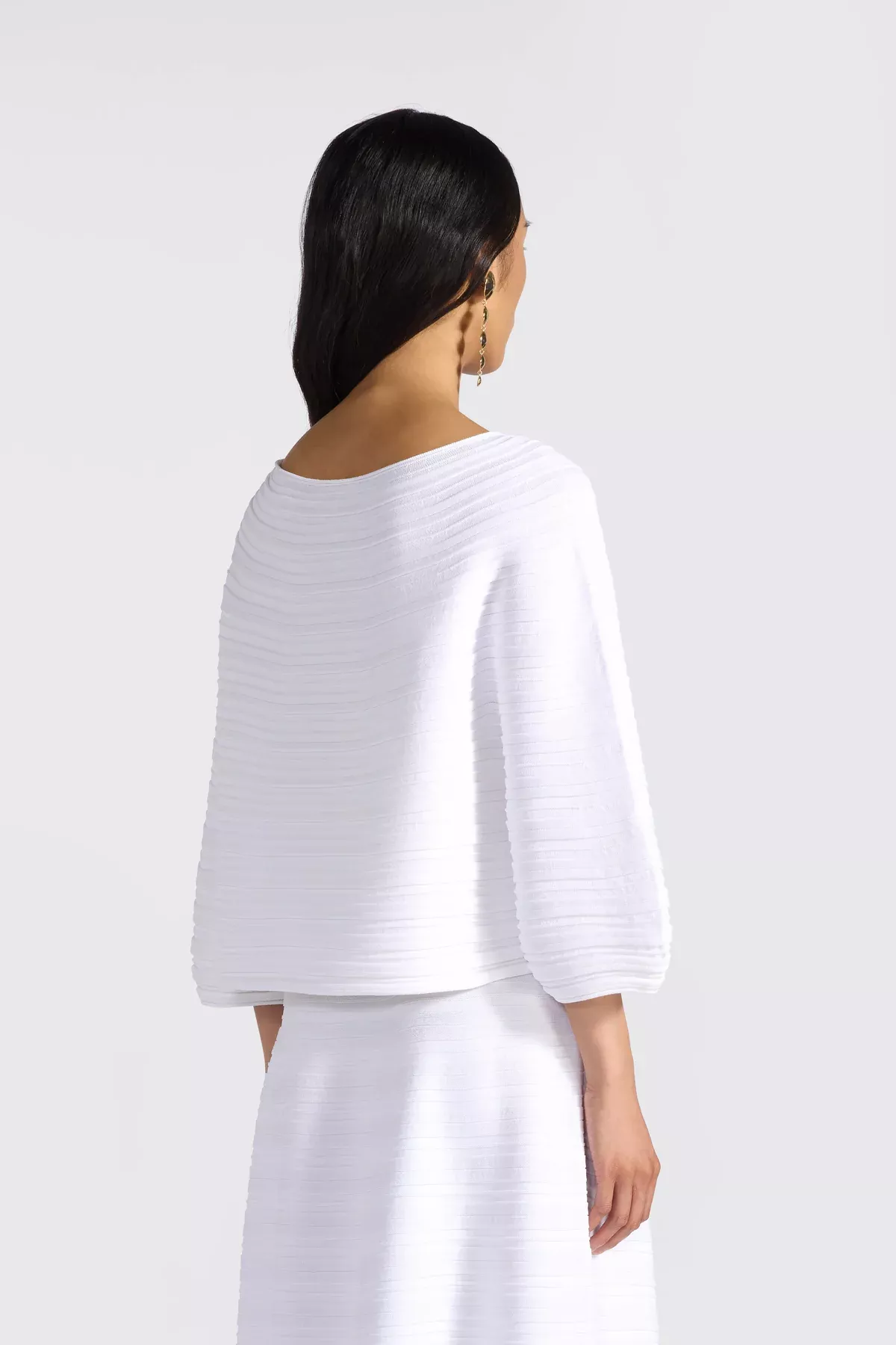 Sueter en punto acanalado horizontal de viscosa elástica. Mangas anchas y acampanadas en la parte inferior, escote barco. Linea ligeramente acampanada.